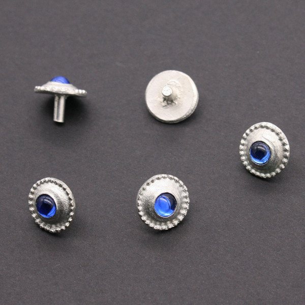Runder Gürtelzierbeschlag aus Zinn mit blauen Glasstein in der Mitte. Nach einem Original aus London, 14.-15. Jahrhundert. Es gibt einen Knopf im selben Design aus dem 13. Jahrhundert. Ein Beispiel für die Beständigkeit mancher beliebten Designs durch die Jahrhunderte hindurch. Zinn / Glas, Durchmesser ca. 1,5 cm. Mit 1 Nietstift auf der Rückseite. Eine Konterscheibe aus Messing wird mitgeliefert.