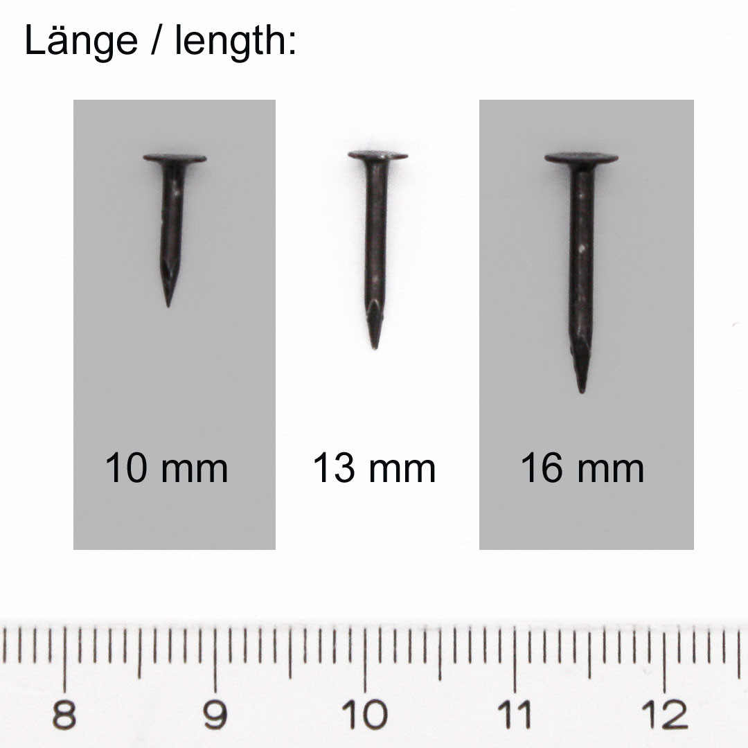 Ca. 13 mm lang, Stiftdurchmesser ca. 1,4 mm, Kopfdurchmesser ca. 4 mm.