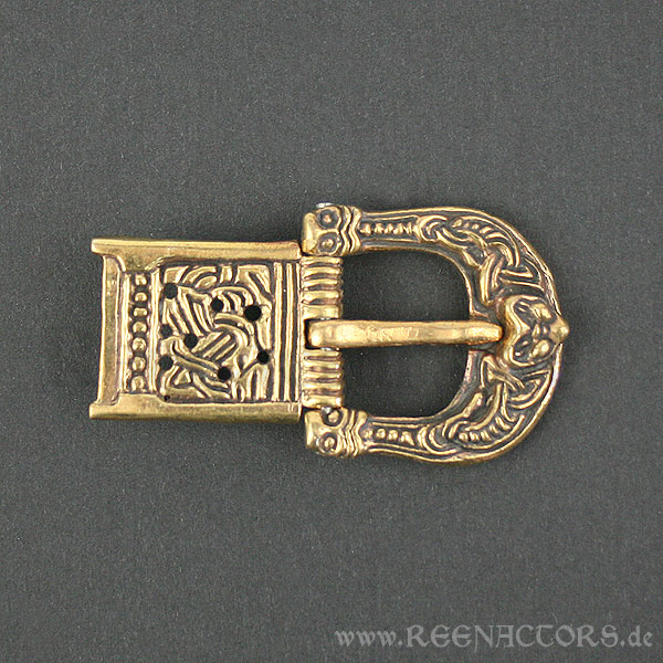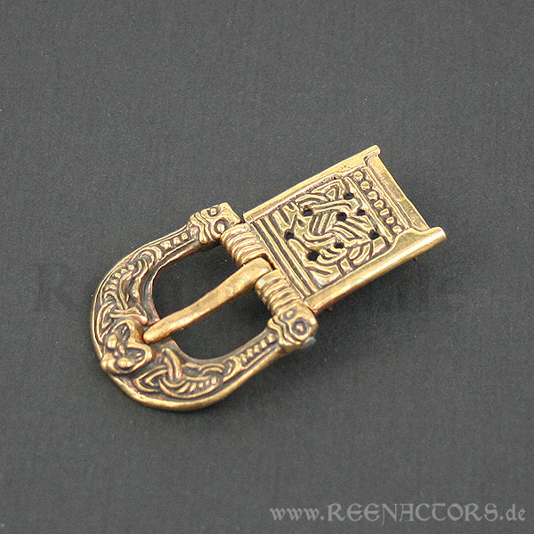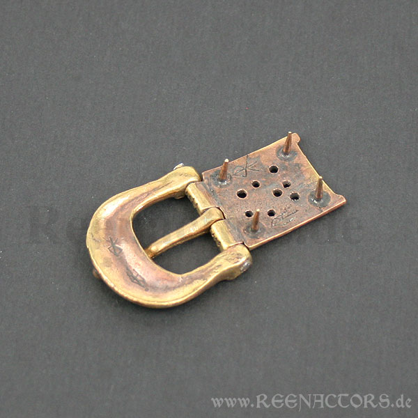 Wikinger-Schließe nach einem Fund in Gotland, 9. / 10. Jahrhundert. Ca. 3 x 5,5 cm. Für eine Riemenbreite von ca. 2 cm (lichtes Maß ca. 1,8 cm). Messing, mit vier angegossenen Nietstiften.