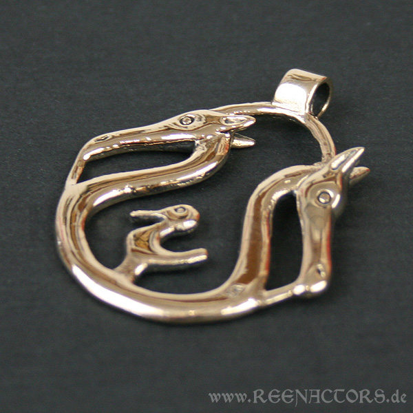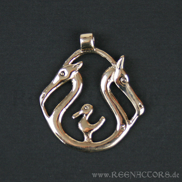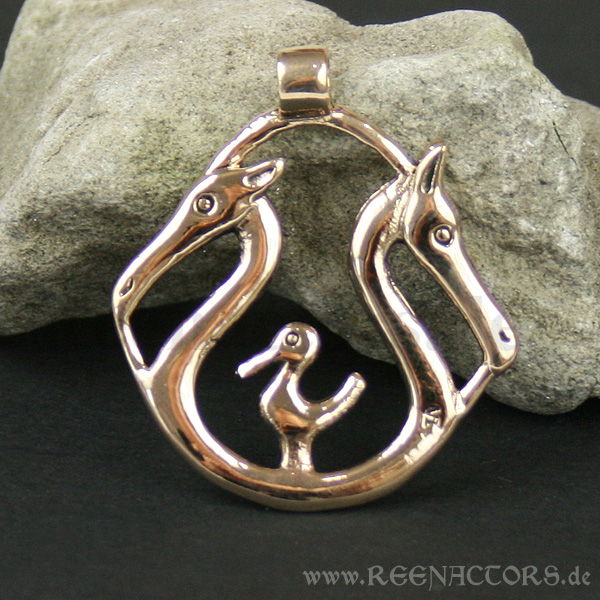 Dieser Anhänger mit den drei Tierfiguren (2 Pferdeköpfe und ein Vogel) ist einem Design nachempfunden, welches ursprünglich den Steven eines kleinen Kultschiffes zierte. Die Vorlage stammt aus der Zeit um ca. 100 v. Chr., Dänemark.