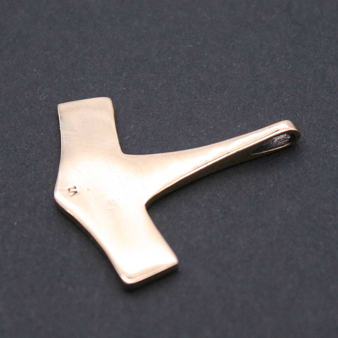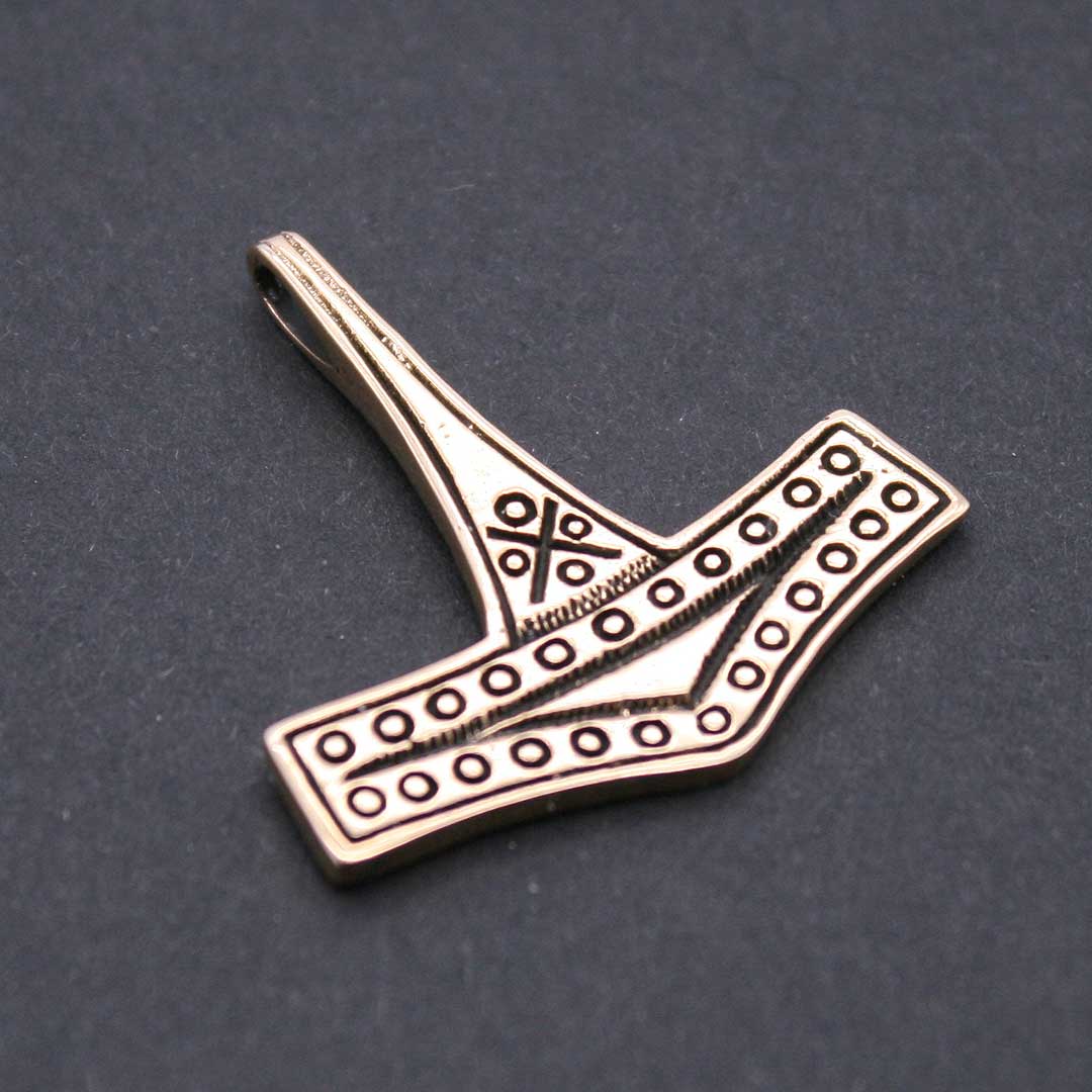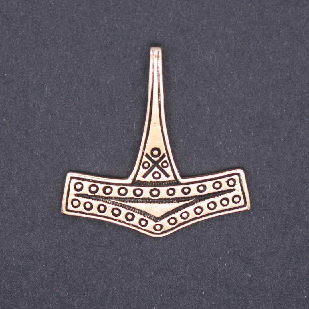 Der "Donnerhammer" der nordischen Gottheit Thor gilt als Symbol von Stärke, Rache und Gerechtigkeit. Das Original dieses Thorhammers stammt aus Bornholm, Dänemark, ca. 10. Jahrhundert n. Chr. Bronze, ca. 3,5 x 3,5 cm. Innen-Durchmesser Öse ca. 2,1 mm.
