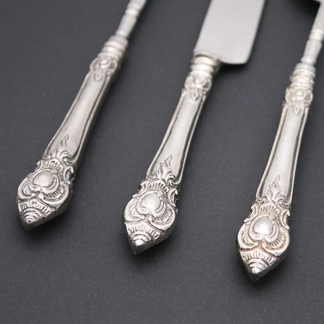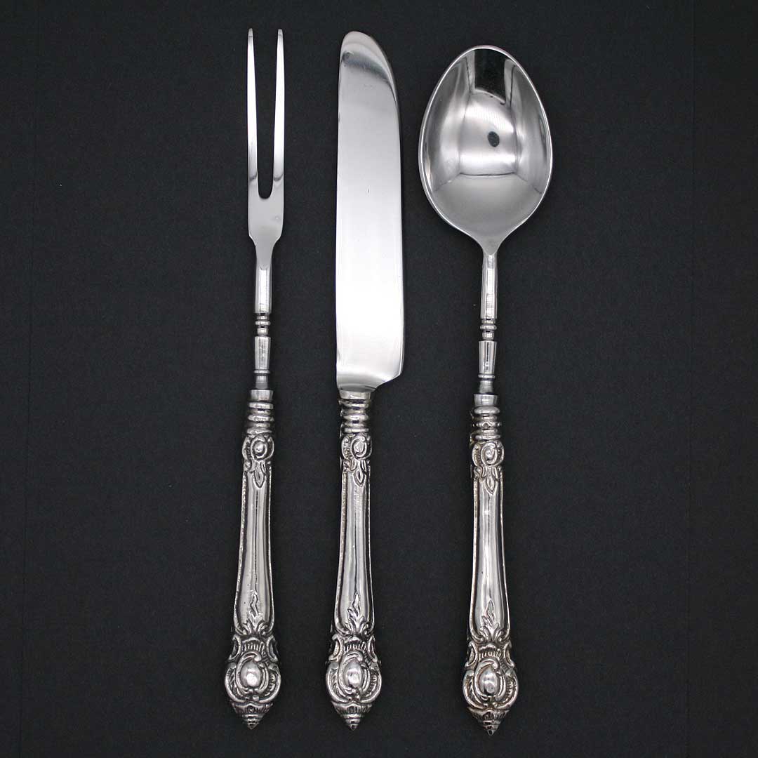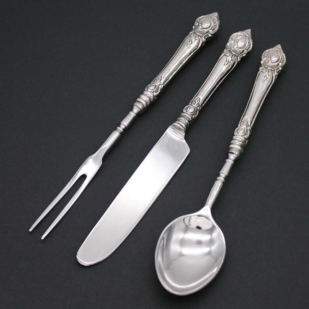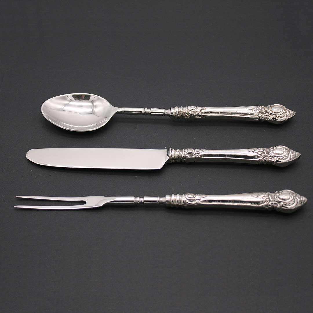 Besteck-Set nach einem Original aus Stockholm, 18. Jahrhundert. Bestehend aus Messer, zweizinkiger Gabel und Löffel. Die Griffe sind aus versilberten Messing. Die vorderen Besteckteile aus rostfreien Edelstahl. Messer: Gesamtlänge ca. 22,5 cm, Klingenlänge ca. 11,5 cm. Gabel: Gesamtlänge ca. 22,5 cm. Löffel: Gesamtlänge ca. 21,5 cm.