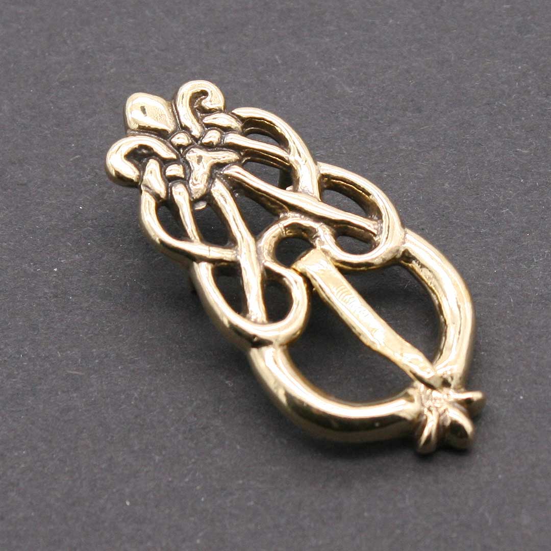 Wikingerzeitliche Gürtelschnalle mit angegossener Gürtelplatte. Nach einem Original aus Gotland, ca. 10.-11. Jahrhundert. Ca. 2,2 x 4,5 cm. Lichte Weite ca. 1,4 cm, Breite Gürtelplatte ca. 2,1 cm - der Riemen muß also zum Ende hin schmäler werdend zugeschnitten werden. Messing, mit drei angegossenen Nietstiften.