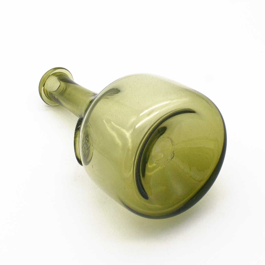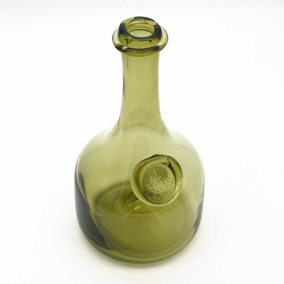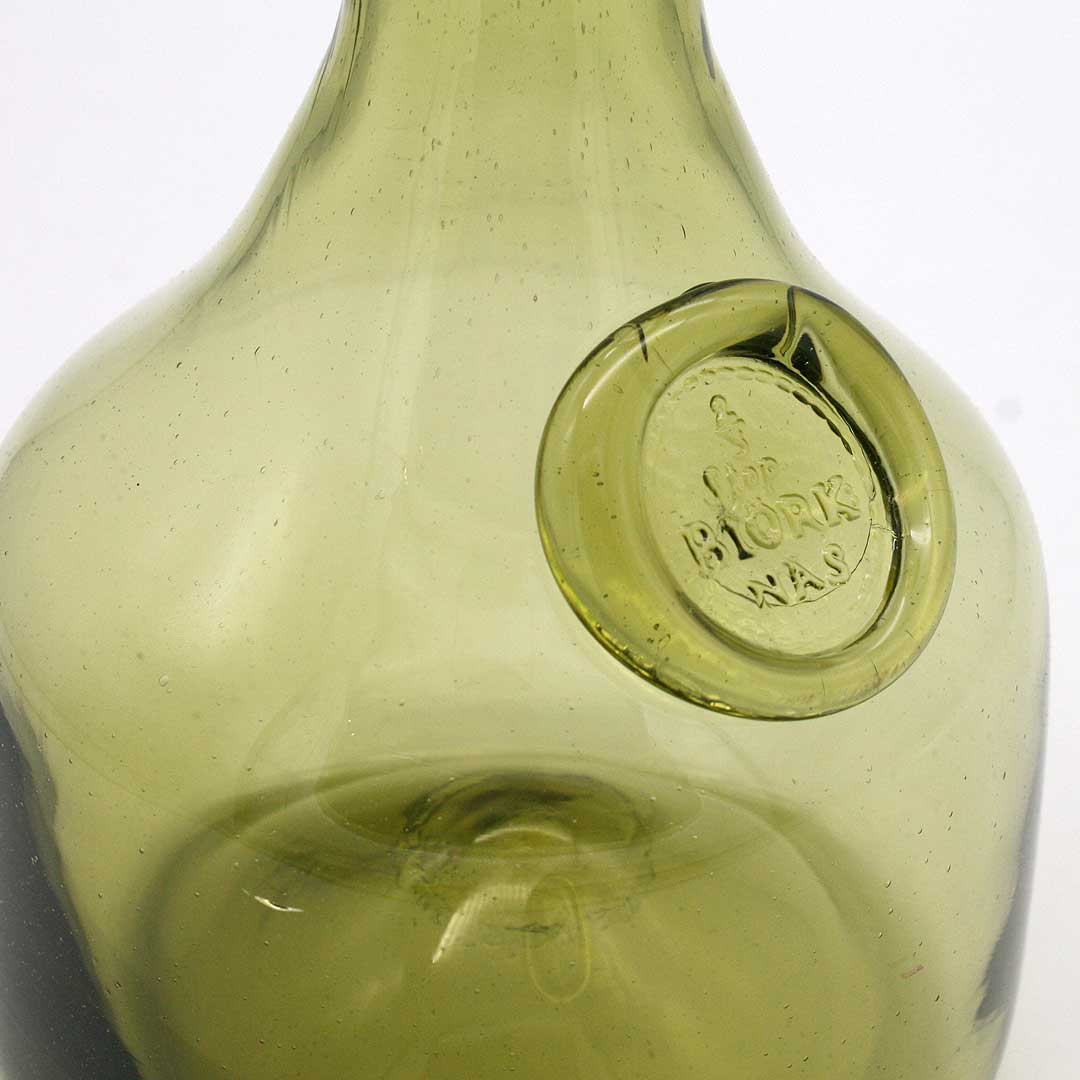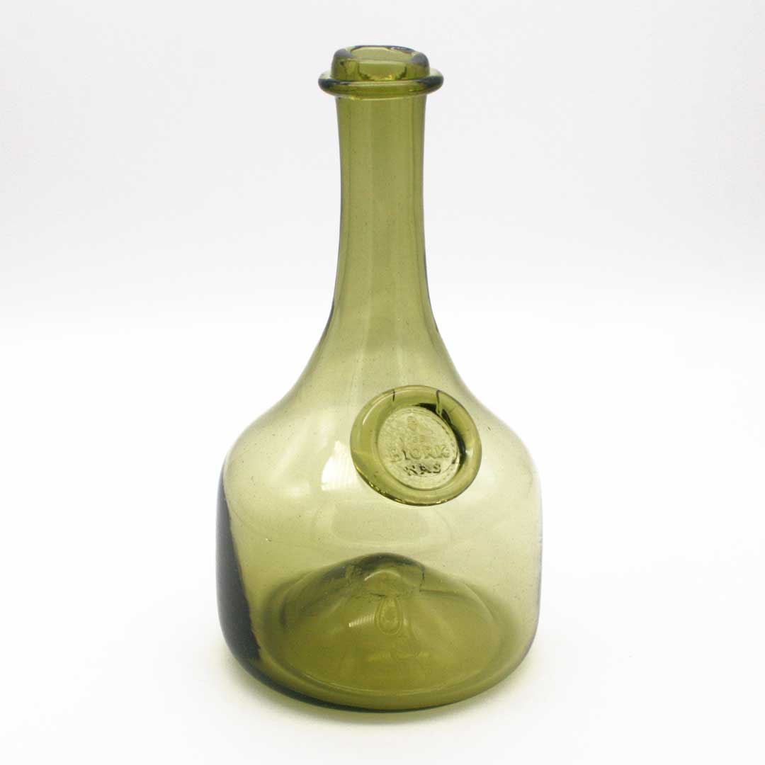 Handgefertigte / mundgeblasene Flasche mit Glassiegel der Glashütte Björknäs. Replikat nach einem Original aus dem 18. Jahrhundert. Die Glashütte Björknäs war eine schwedische Glashütte, 1736 in Björknäs auf der Insel Värmdön gegründet. Grünliches Glas / Waldglas, mit gewölbten Boden. Höhe ca. 22 cm, Durchmesser ca. 12 cm. Füllmenge ca. 0,75 Liter.