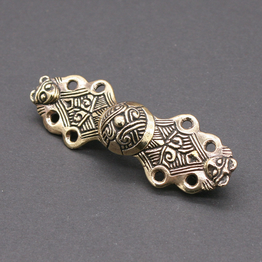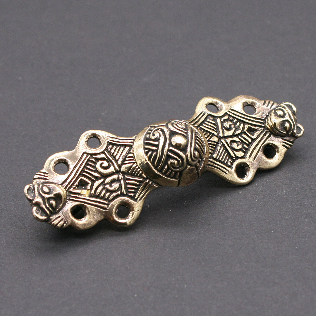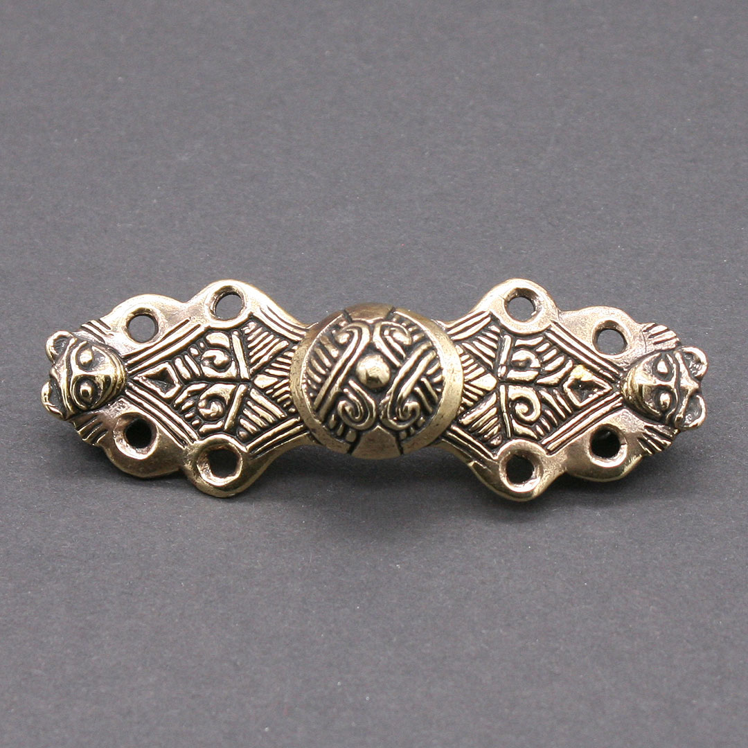 Gleicharmfibel nach einem Original aus Birka, ca. 9.-10. Jahrhundert. Eine typische Form der Wikingerzeit. Fibeln dieser Art gehören zur Frauentracht und dienten nach der Fundlage zum Verschliessen von einem Klappenrock oder auch als Verschluß für eine Variante des Schürzenkleides. Messing, ca. 7,5 x 2,5 cm, mit stabiler Nadel aus Eisen.