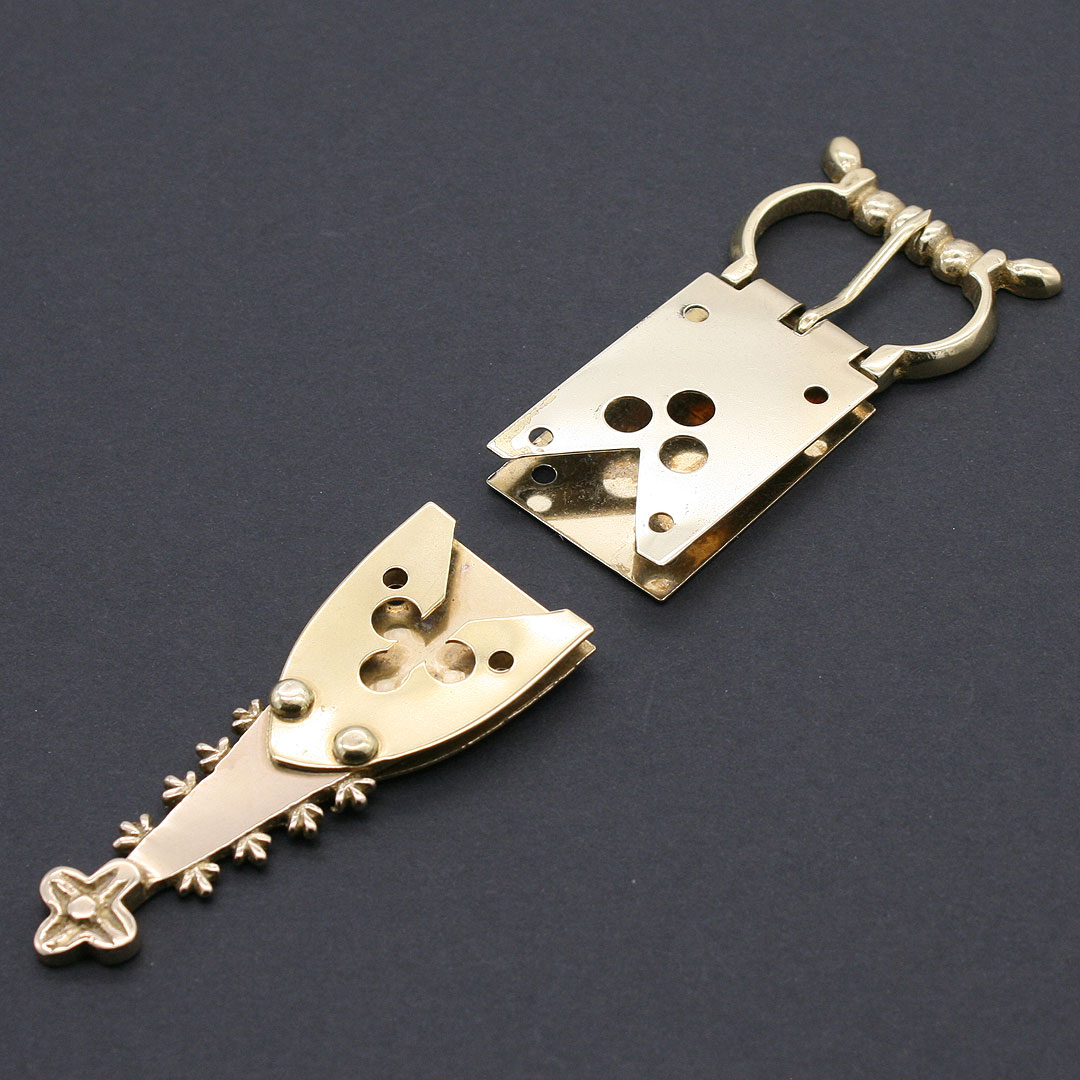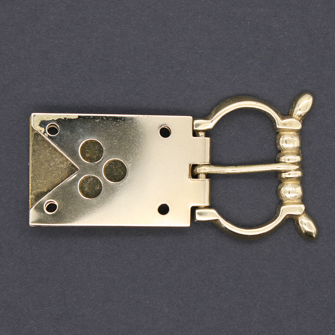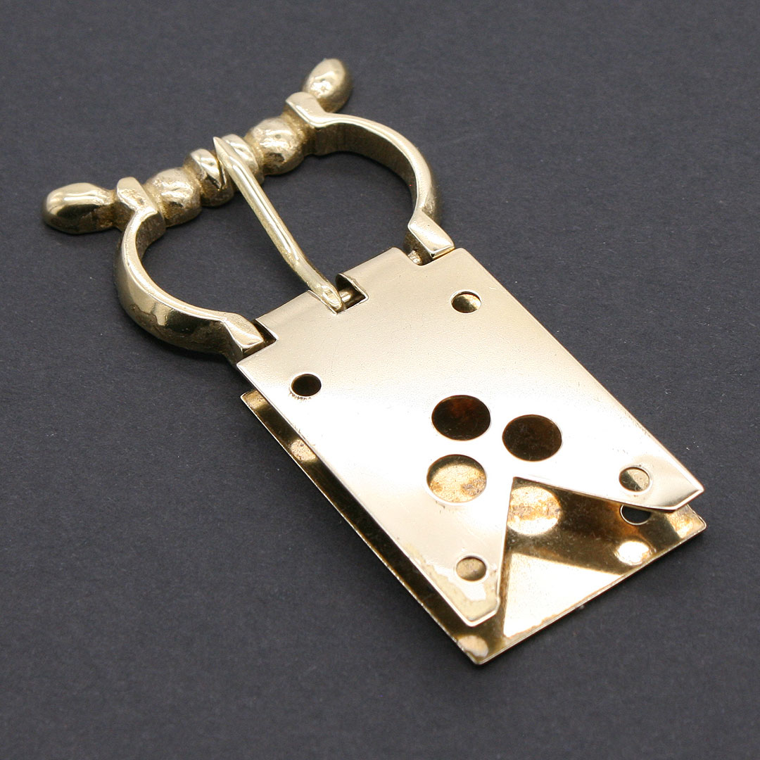 Typische Gürtelschnalle für das 14. Jahrhundert. Mit Gürtelblech. Das Gürtelblech ist mit einem Durchbruch-Lochmuster verziert. Messing, Größe mit Gürtelblech ca. 4,2 x 8 cm. Schließe ca. 3,5 x 4,2 cm. Lichte Weite ca. 3,3 cm. Für eine Riemenbreite von ca. 3,1 cm (Breite Gürtelblech ca. 3,1 cm). Vier Messingnietstifte werden mitgeliefert.