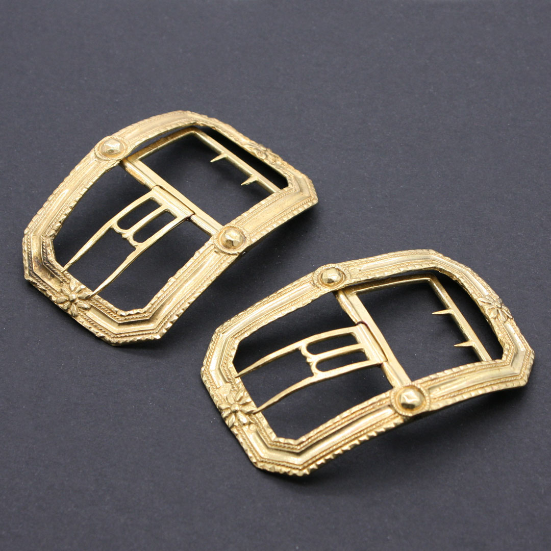 Schuhschließen nach französischen Originalen aus dem späten 18. Jahrhundert. Diese fein ausgearbeiteten Schuhschnallen sind für zivile Darstellungen des späten 18. und frühen 19. Jahrhunderts geeignet. Messing, je ca. 7,8 x 5,1 cm. Innenmaß für Lasche ca. 3,3 cm. Preis für 1 Paar.