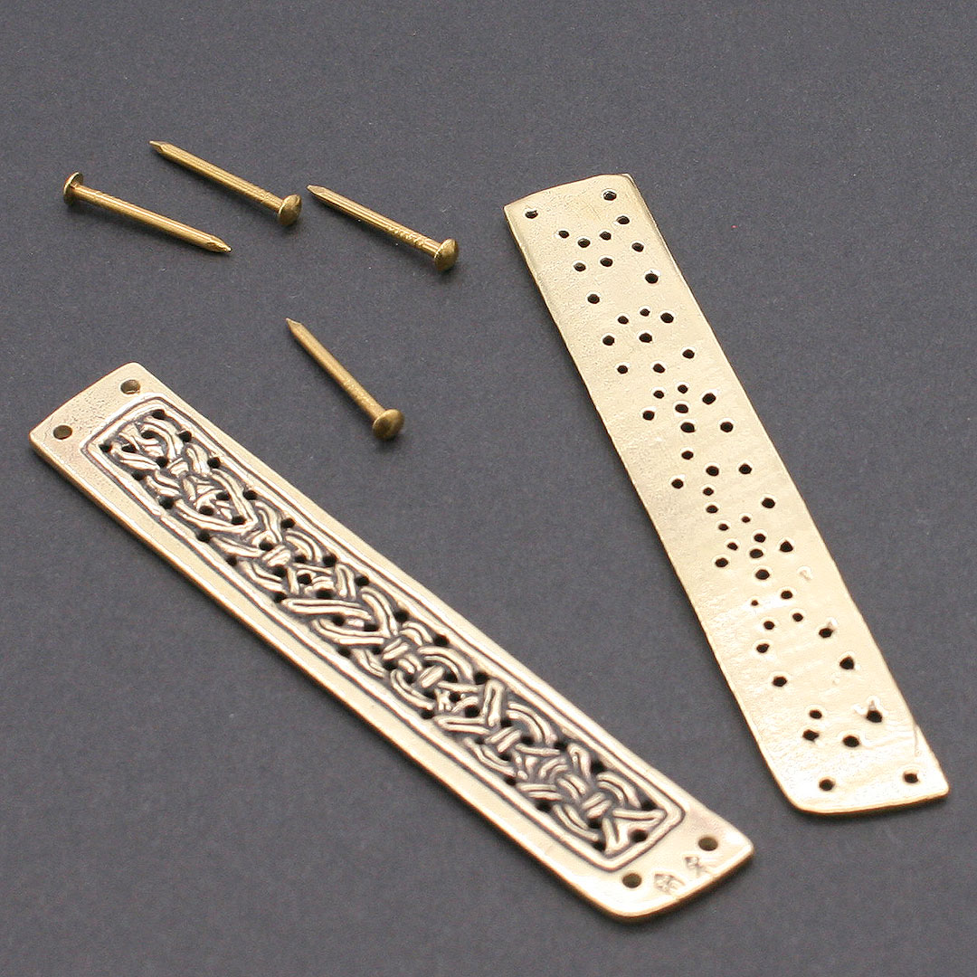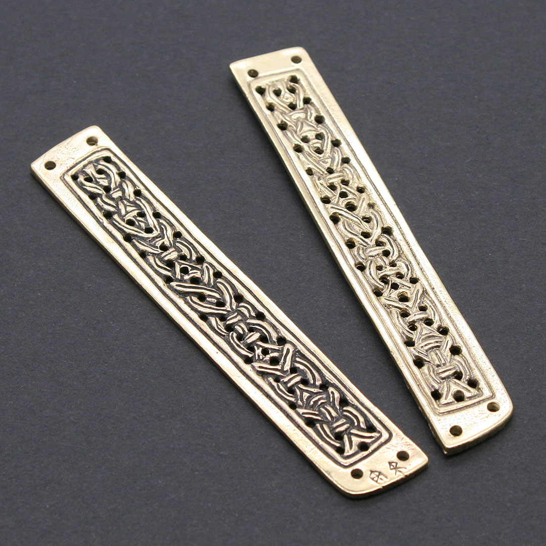 1 Paar Zierbeschläge für eine Messerscheide. Die Beschläge sind mit einen durchbrochenen Flechtbandmuster fein ausgearbeitet. Nach Fund aus Gotland, ca. 10. Jahrhundert.