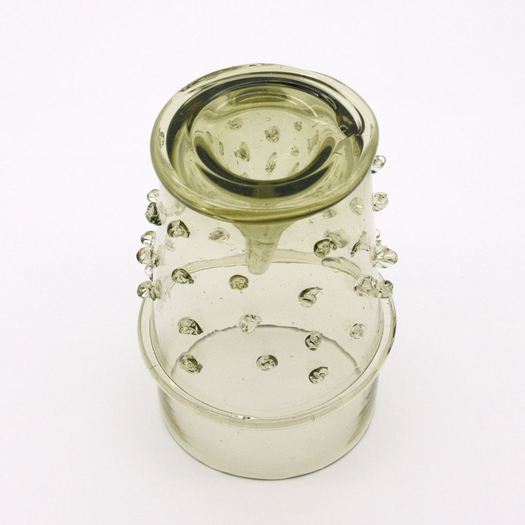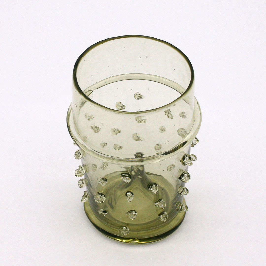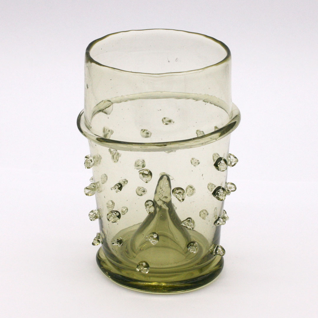 Handgefertigter Glasbecher, sogenannter Nuppenbecher, grünliches Glas. Mit kleinen Nuppen besetzt, der obere Rand ist mit einer Fadenauflage abgesetzt. Mit hochgezogenen Boden. Nach einem Original des 14. Jahrhunderts aus Deutschland. Höhe ca. 12 cm, Durchmesser ca. 8 cm. Füllmenge ca. 0,35 Liter.