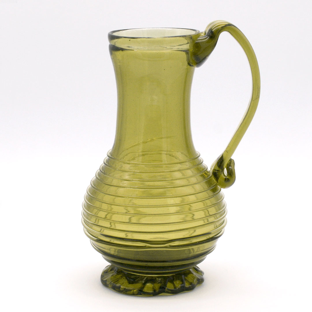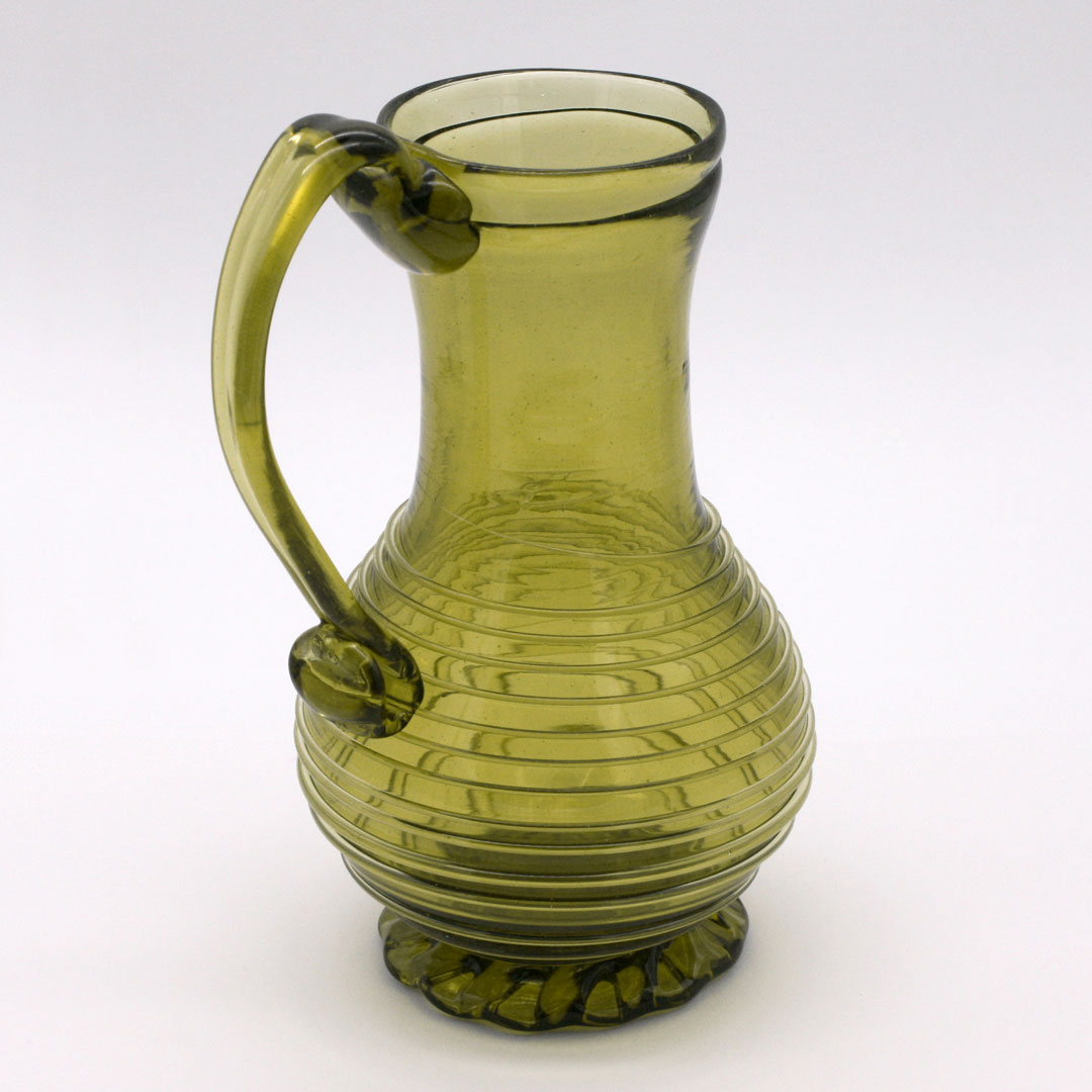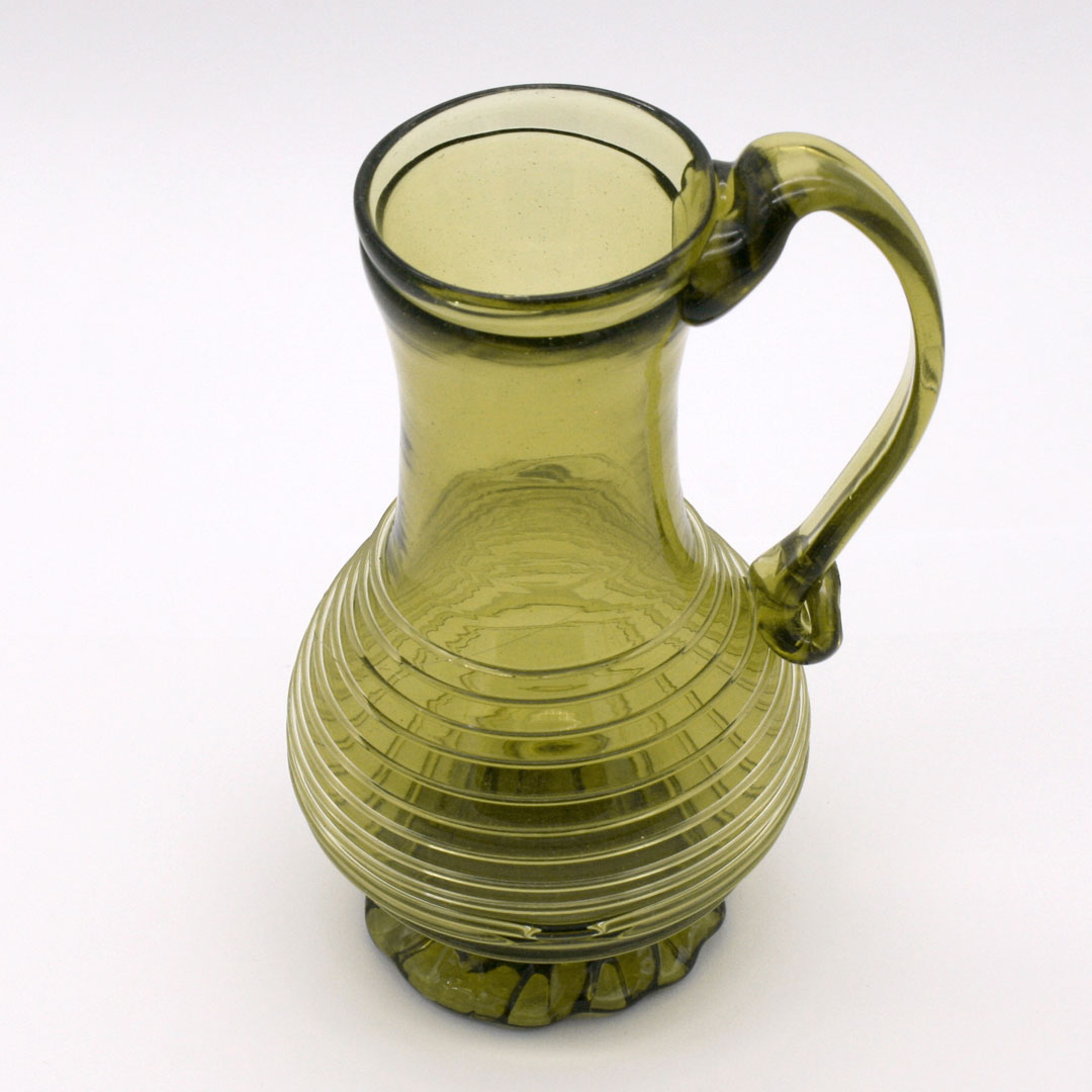 Handgefertigter Glaskrug / Henkel-Karaffe mit spiralförmiger Fadenauflage und gekerbten Standfuß. Replikat nach europäischen Originalen des 16. Jahrhunderts. Grünliches Glas / Waldglas. Ein ähnlicher Krug findet sich zum Beispiel im Germanischen Nationalmuseum in Nürnberg.