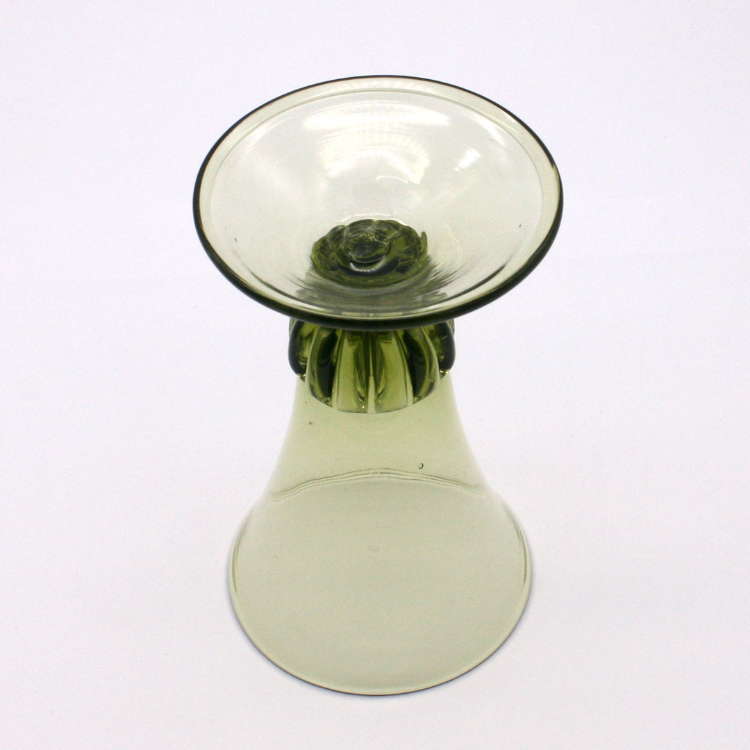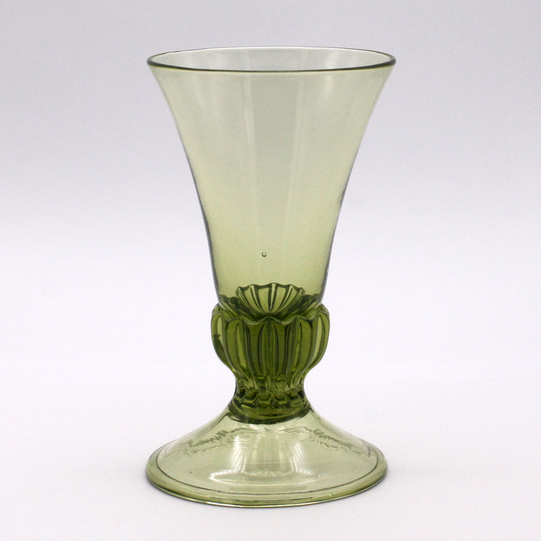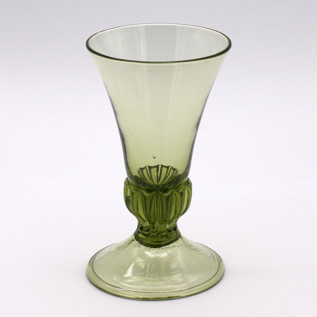 Handgefertigtes, mundgeblasenes Renaissance Wein- oder Likörglas mit gerippten Übergang zum Standfuß. Replikat nach einem Original aus Frankreich, 16. Jahrhundert. Grünliches Glas / Waldglas.