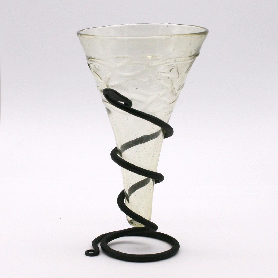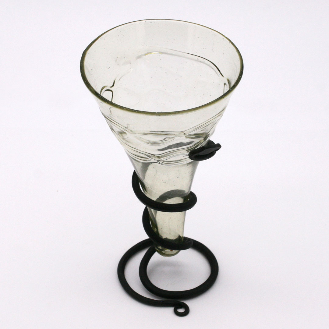 Handgefertigter Glasbecher / Trichterbecher nach einem frühmittelalterlichen Fund aus einer Wikinger-Bestattung, Birka. 9. / 10. Jahrhundert. Leicht grünliches Glas mit Glasfadendekor. Höhe ca. 14,5 cm, Durchmesser ca. 9 cm. Füllmenge ca. 0,18 Liter.