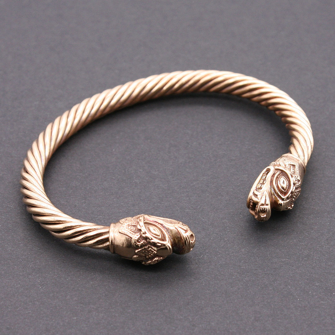 Armspange aus verdrehten Bronzedrähten mit 2 angesetzten gegossenen Drachenköpfen im Wikingerstil.