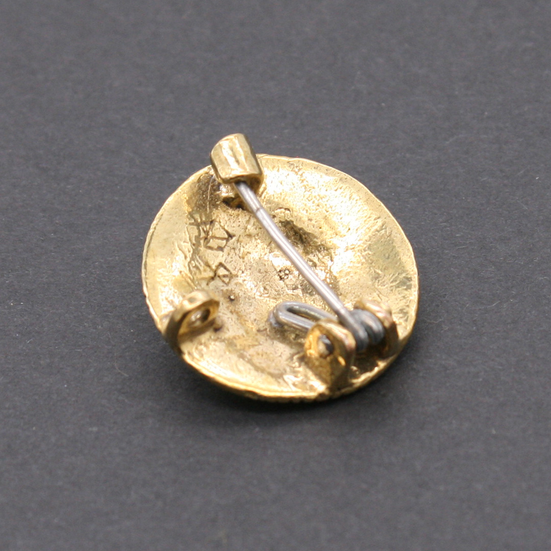 Messing, ca. 2,5 cm Durchmesser. Mit stabiler Eisen-Nadel. Auf der Rückseite ist eine Öse für Ketten oder Anhänger.