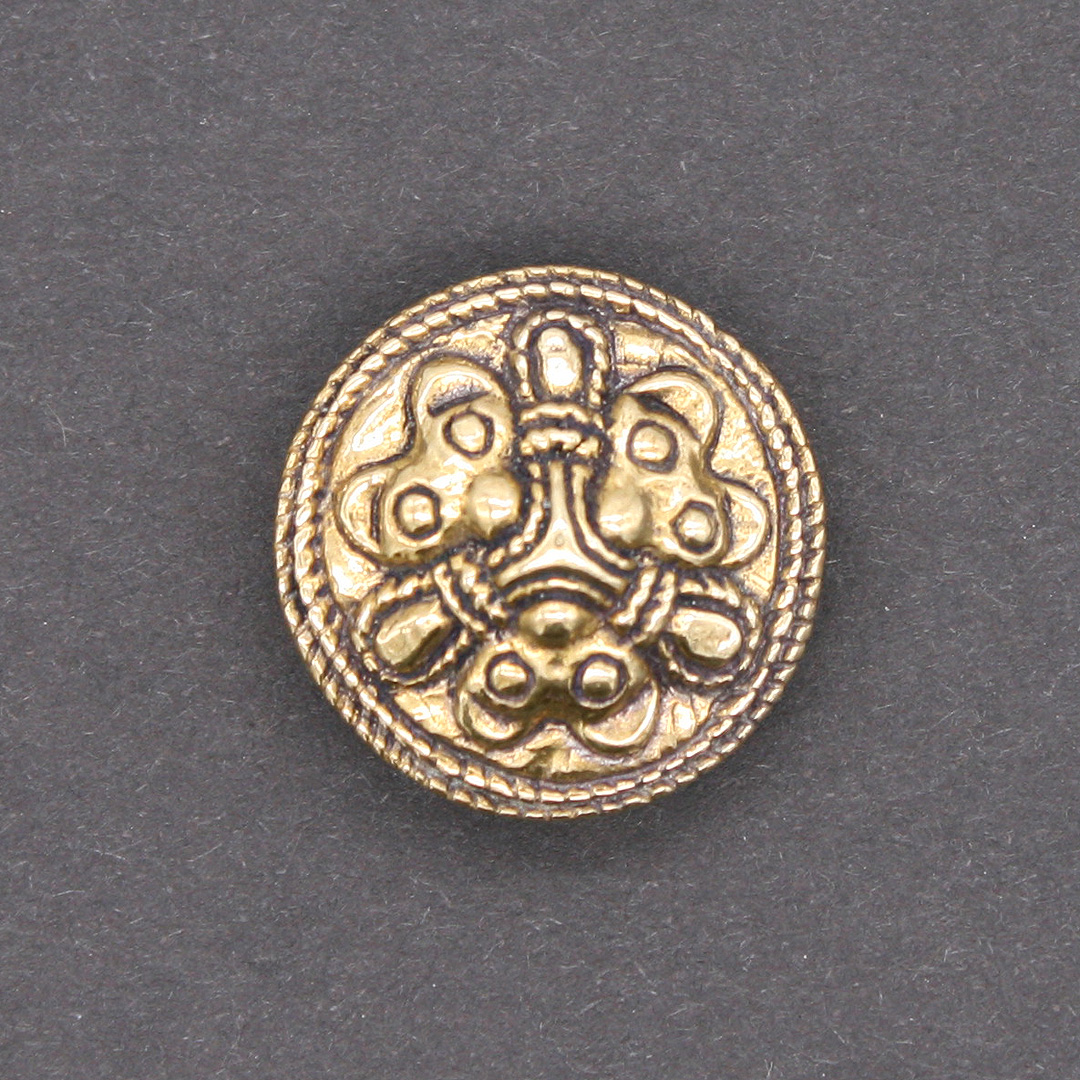 Kleine Scheibenfibel der Wikinger mit drei stilisierten Tierköpfen. Nach einem Original aus Birka, ca. 10. Jahrhundert. Borre-Stil, Grab 1095. Ähnliche Fibeln finden sich auch an anderen Wikinger-Fundstätten. Die Köpfe werden je nach Ansicht als Wölfe, Bären oder auch Katzen interpretiert.