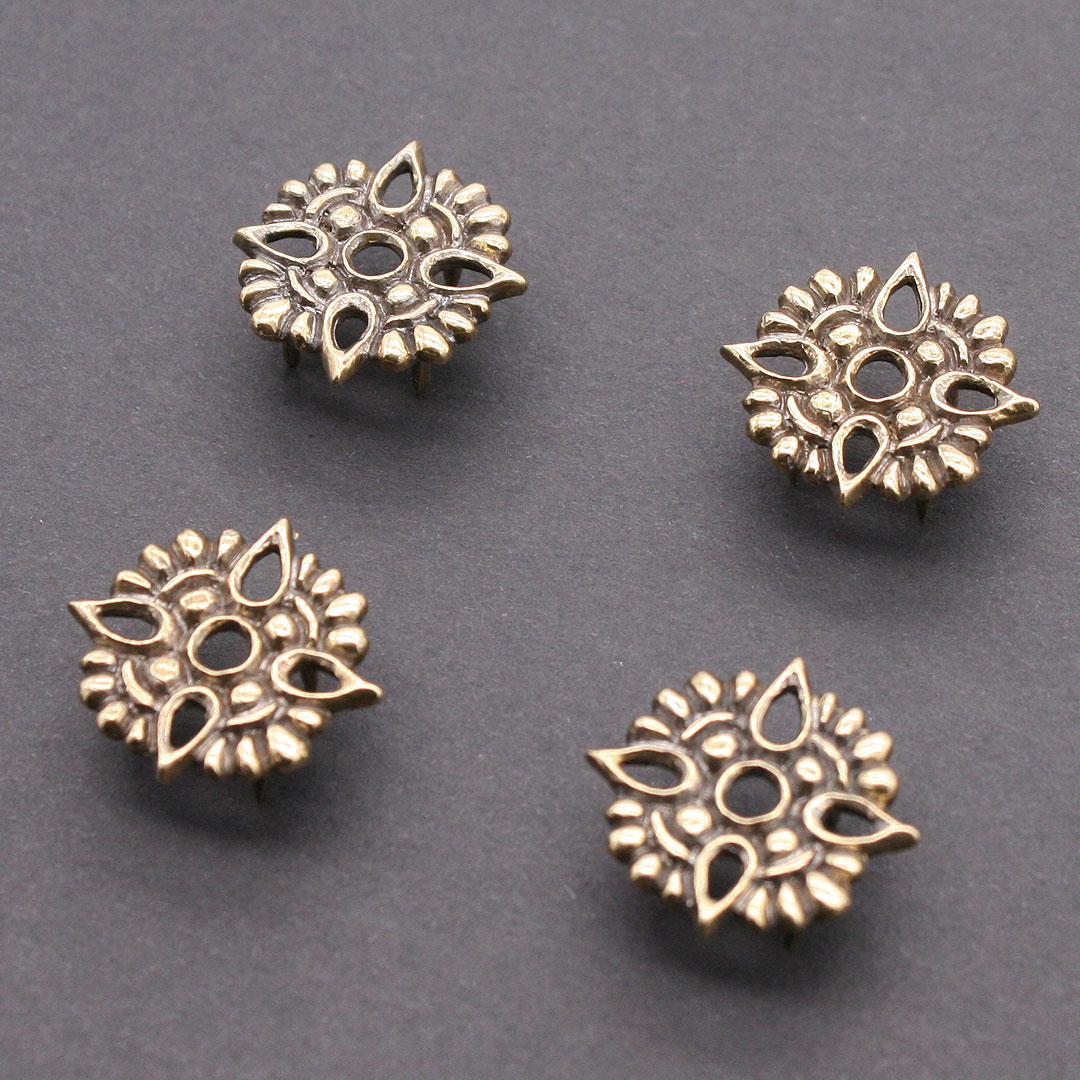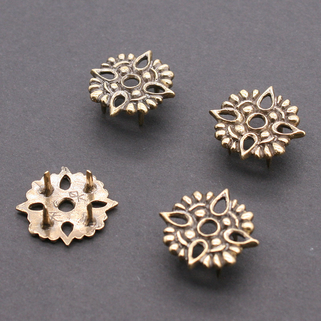 4 Stück magyarische / ungarische Taschenbeschläge für sogenannte Säbeltaschen / Tarsoly Taschen. Solche Taschenbeschläge und magyarischen Gürteltaschen waren auch bei den Wikingern, Rus und Kiewer Wikingern verbreitet. Die Beschläge sind nach Originalen aus Taska, Ungarn, ca. 10. Jahrhundert. Messing, je ca. 2,2 x 2,2 cm. Mit vier Nietstiften auf der Rückseite. Preis für 4 Stück.