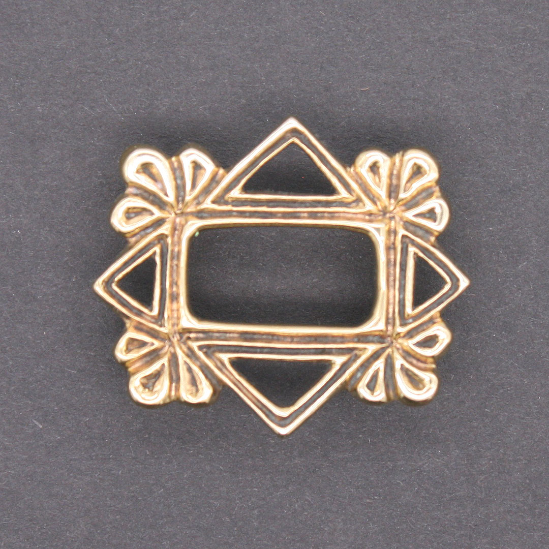 Magyarischer Taschenbeschlag für sogenannte Säbeltaschen / Tarsoly-Taschen. Es handelt sich um einen Mittelbeschlag, durch den die Verschlußlasche geführt wird. Solche Taschenbeschläge waren auch bei den Wikingern und Rus-Wikingern für Gürteltaschen verbreitet. Nach einem Original aus Karos, Ungarn, ca. 10. Jahrhundert. Messing, ca. 3,8 x 3,2 cm. Mit vier Nietstiften auf der Rückseite.