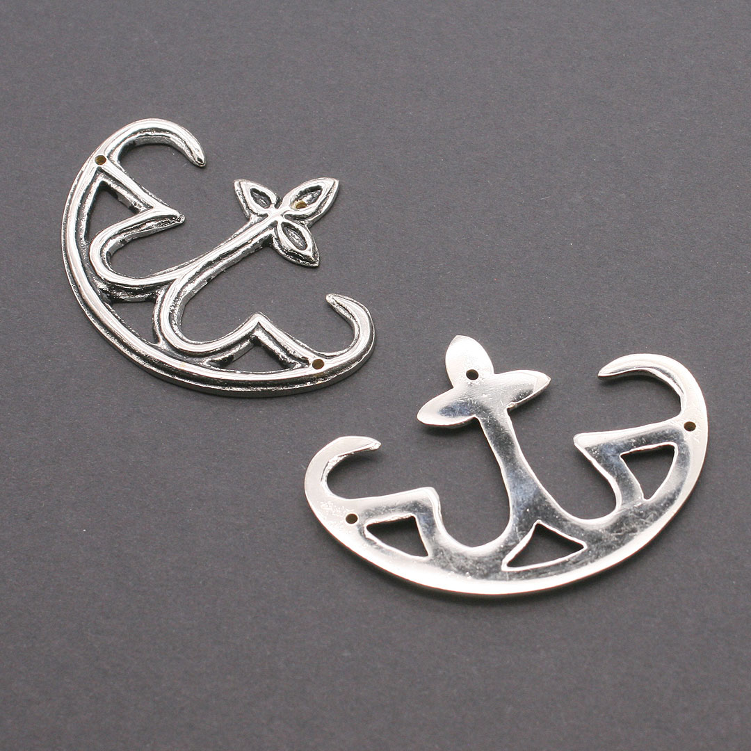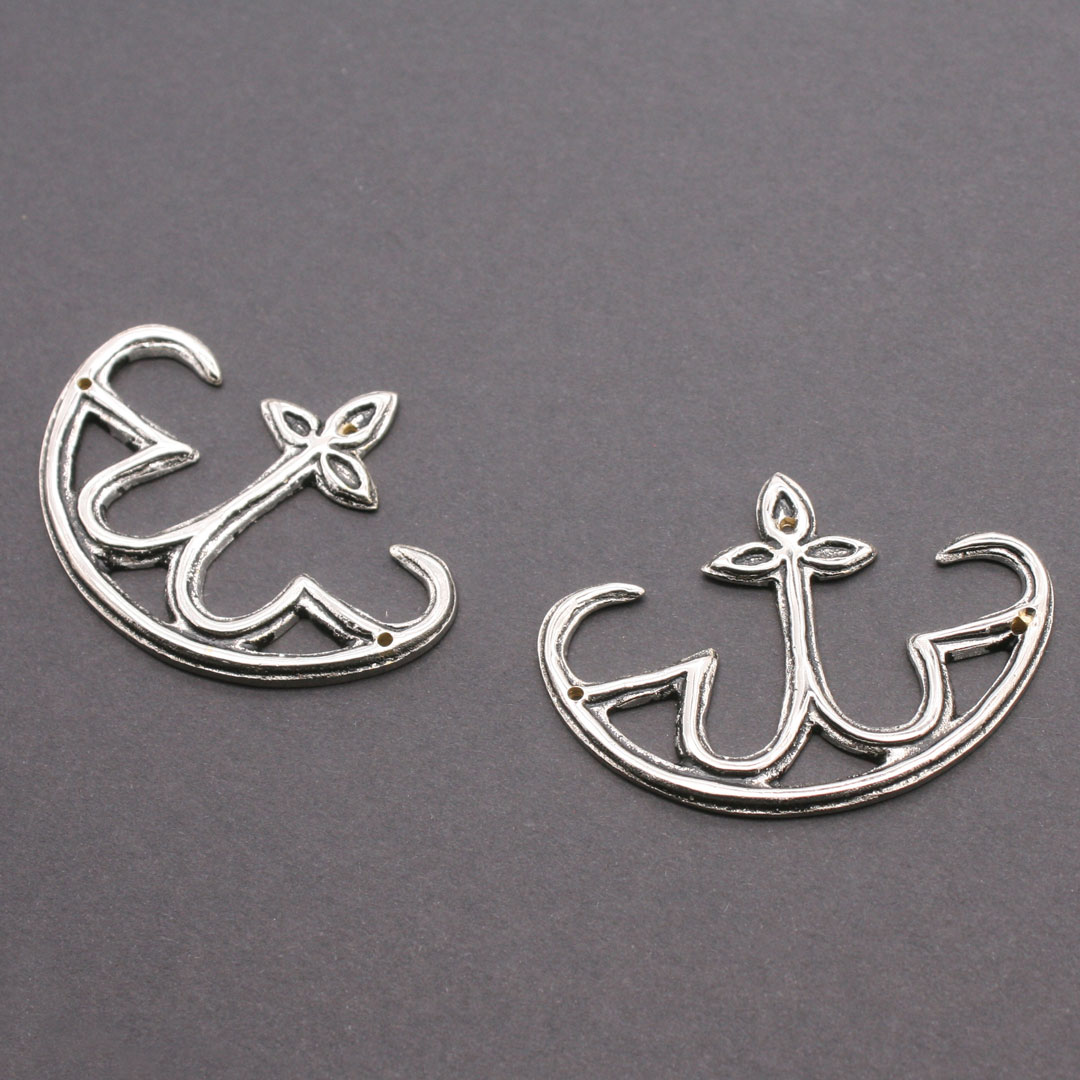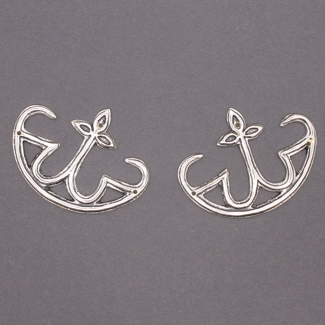 Florale Beschläge für Taschenklappen von spätmittelalterlichen Gürteltaschen. Die Beschläge dienten bei diesen oft nierenförmigen Taschen gleichzeitig als Zierde und Gewicht für die Klappe. Nach Abbildungen aus dem 15. Jahrhundert. Messing versilbert, je ca. 6,7 x 5,1 cm. Mit jeweils 3 Bohrungen zum Annähen oder Vernieten.