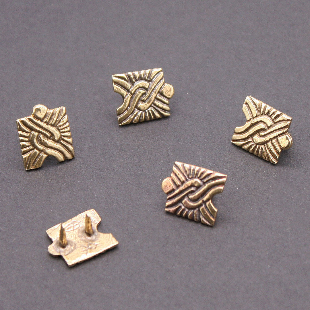 Messing, ca. 1,1 breit und 1,3 cm lang. Mit zwei Nietstiften auf der Rückseite.