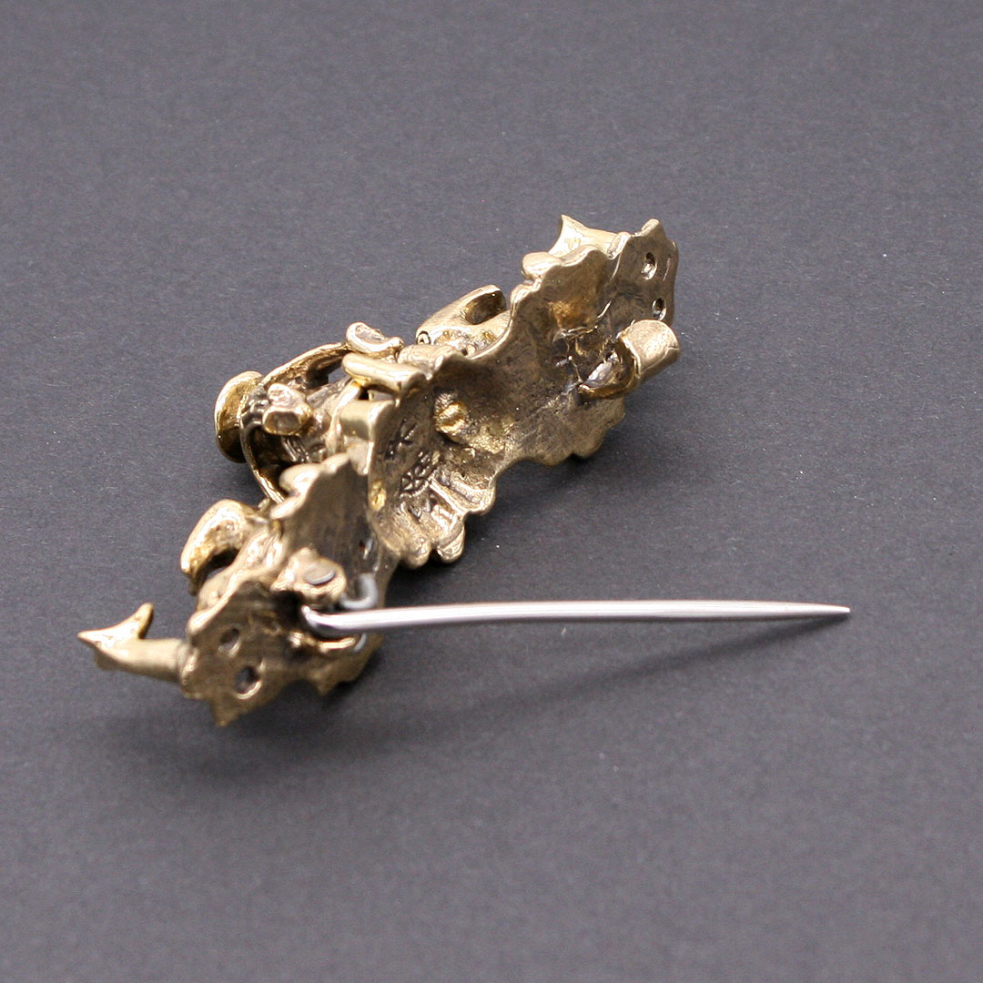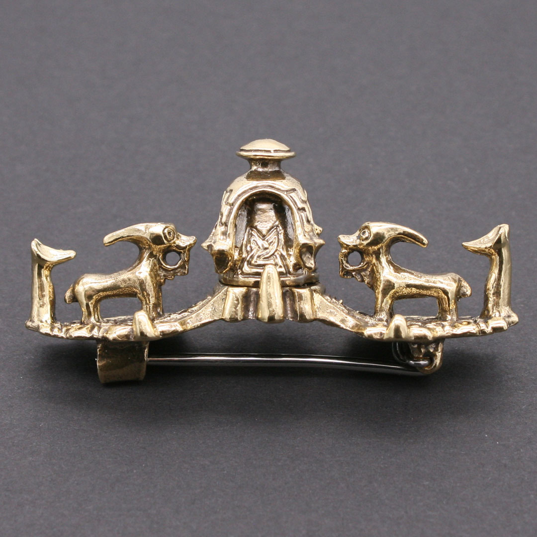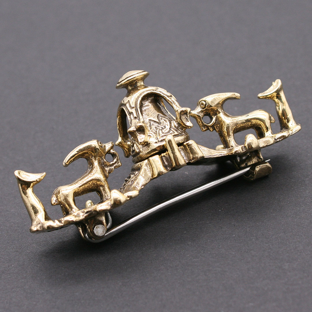Aufwendig gearbeitete Gleicharmfibel nach einem Original aus Gotland, ca. 10. Jahrhundert. Auf der Brosche sind zwei Ziegenböcke und zwei andere Tierfiguren (Füchse oder Wölfe?). Es liegt nahe, in den beiden Ziegen Thors Böcke Tanngnióstr (Zähneknirscher) und Tanngrisnir (Zähneblecker) zu sehen. Fibeln dieser Art finden sich auch an anderen skandinavischen Fundorten. Ein ähnliches Exemplar stammt zum Beispiel aus Birka. Fibeln dieser Art gehören zur Frauentracht und dienten nach der Fundlage zum Verschliessen von einem Klappenrock oder auch als Verschluß für eine Variante des Schürzenkleides. Messing, ca. 7,6 x 2,2 x 3,8 cm, Nadel aus Eisen.