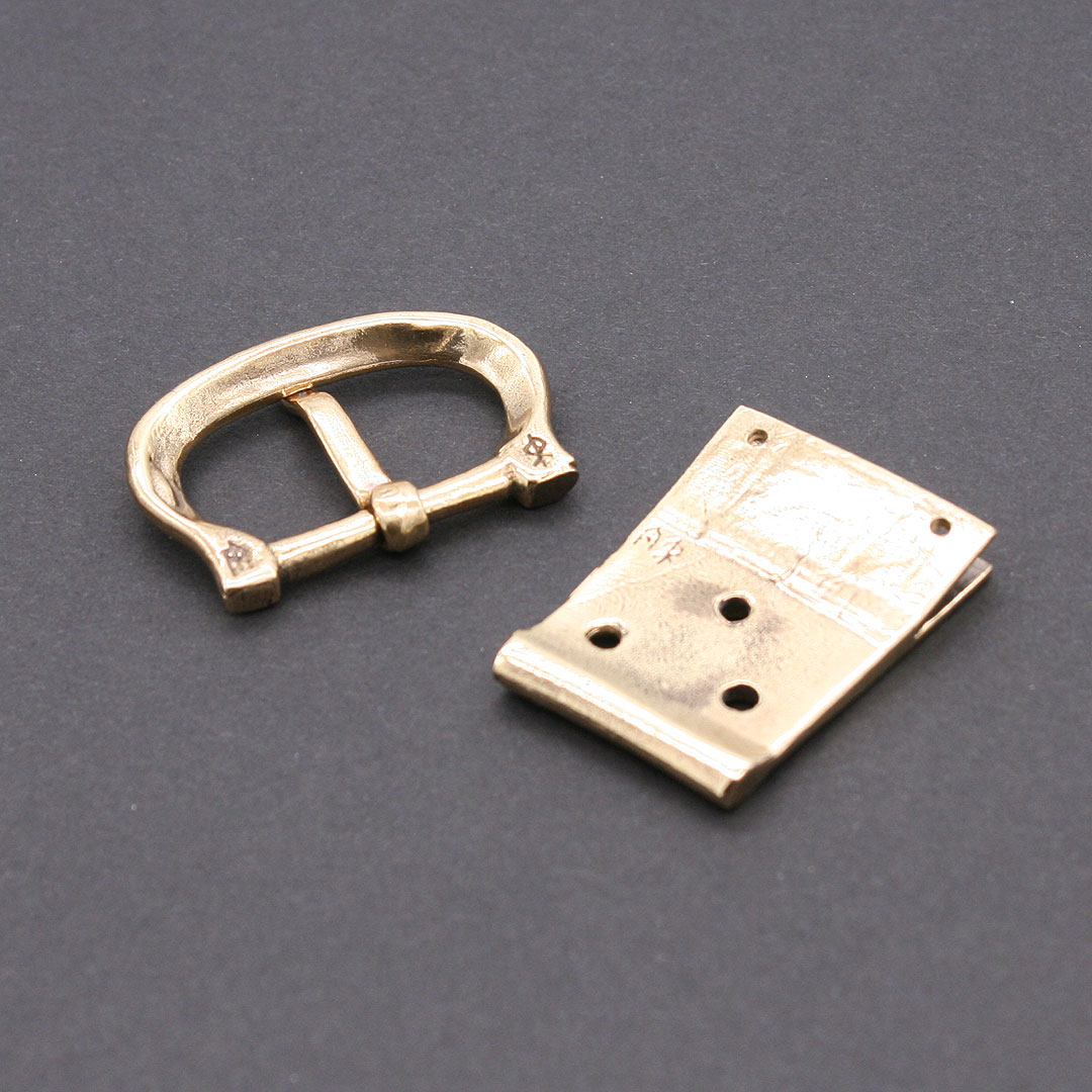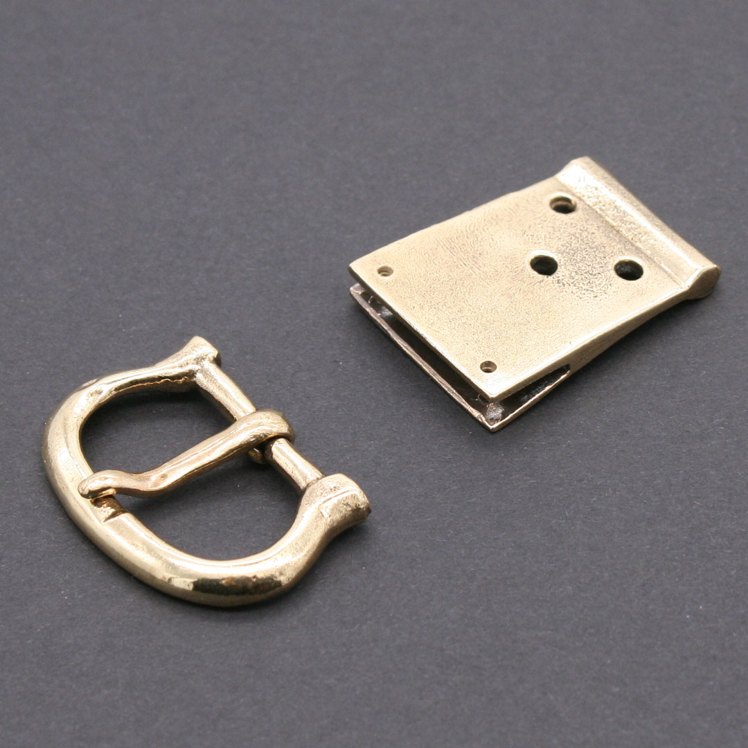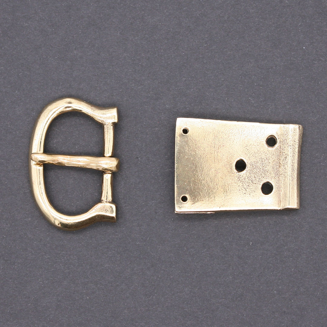 Gürtelschliesse: Messing, ca. 2,9 x 4,2 cm, Steg ca. 2,4 cm, Lichte Weite ca. 3,2 cm.