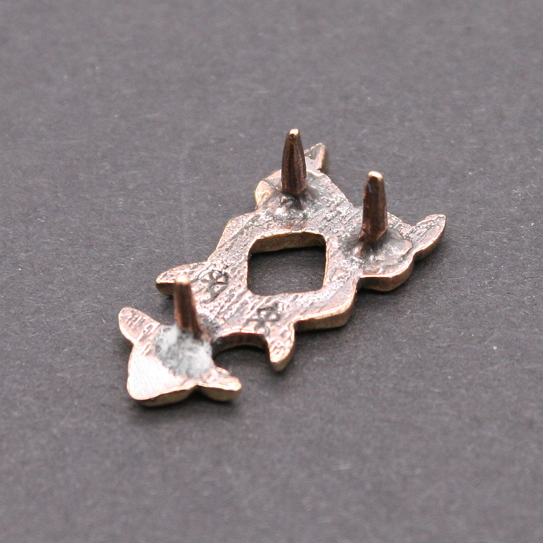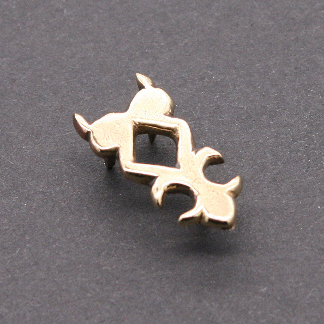 Kleiner Gürtelendbeschlag mit durchbrochenen Muster. Nach einem Fund aus Novgorod, 14. Jahrhundert. Messing, ca. 1,3 x 2,5 cm. Für eine Riemenbreite von ca. 1,3 cm. Mit drei angegossenen Nietstiften.
