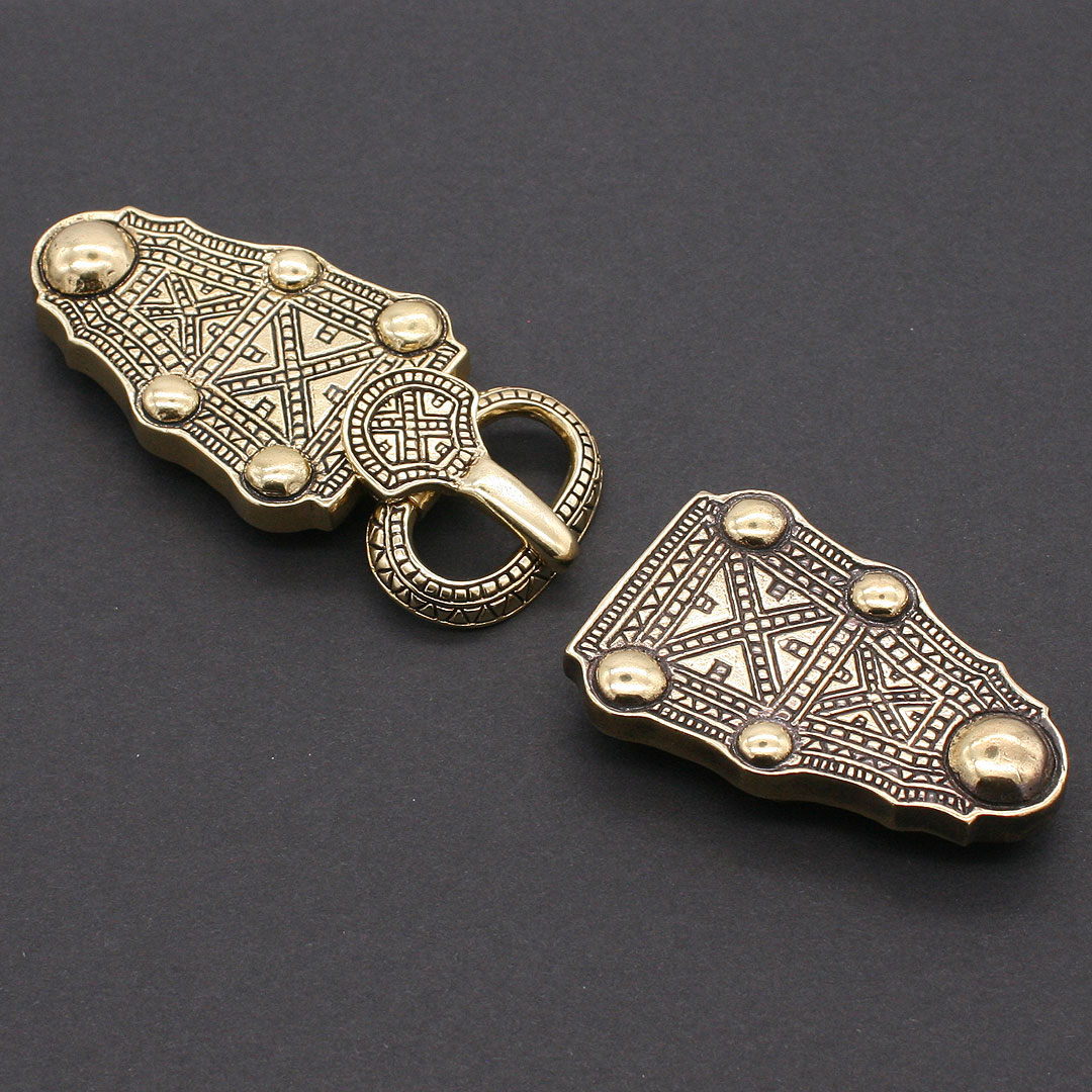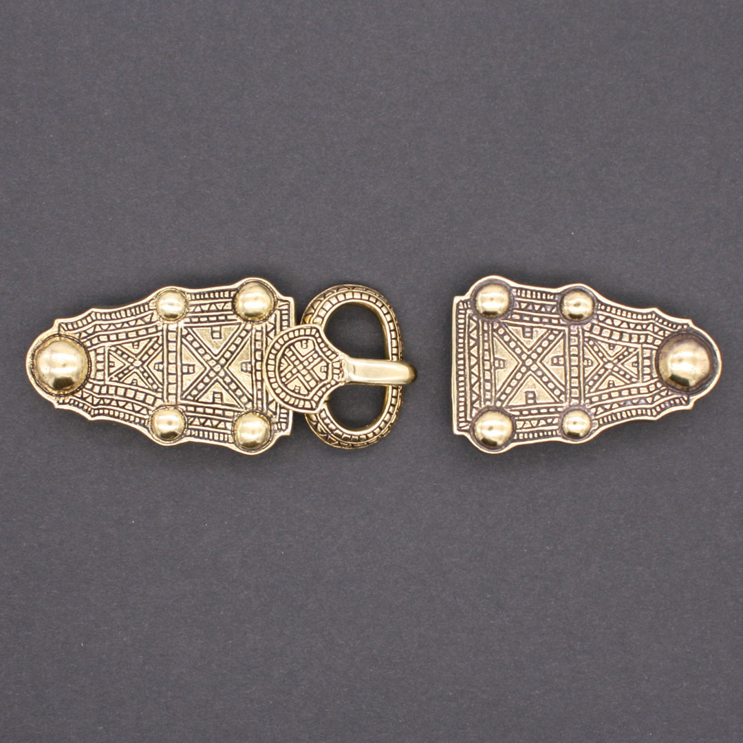 Prunkvolles Merowinger Gürtelset bestehend aus Gürtelschnalle (sogenannte Schilddornschliesse) mit Gürtelbeschlag und passenden Gegenbeschlag. Nach einem Original aus Frankreich, ca. 7. Jahrhundert. Die Vorlage befindet sich im Museum für Altertümer in Rouen, Frankreich. Gürtelschliesse mit Beschlag: Messing, ca. 9,1 x 4,3 cm. Lichte Weite ca. 2,8 cm. Gegenbeschlag: Messing, ca. 6,4 x 4,3 cm. Für eine Riemenbreite von mindestens ca. 4,5 cm. Beide Teile haben auf der Rückseite Ösen zur Befestigung.